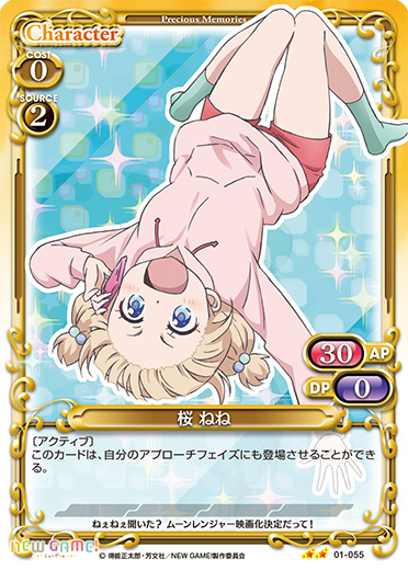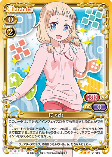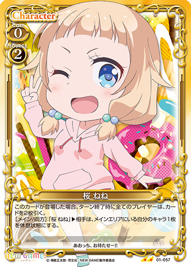 | このカードが登場した場合、ターン終了時に全てのプレイヤーは、カードを2枚引く。[メイン/両方]:「桜 ねね」▸相手は、メインエリアにいる自分のキャラ1枚を休息状態にする。 | ||