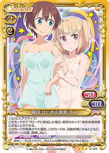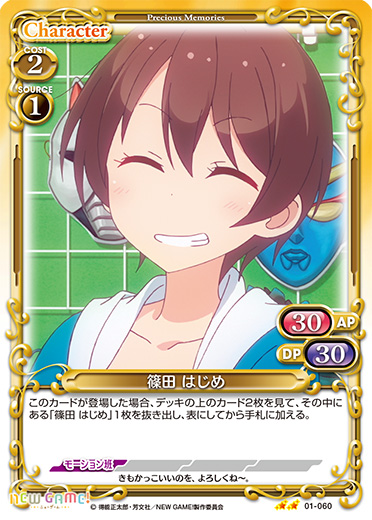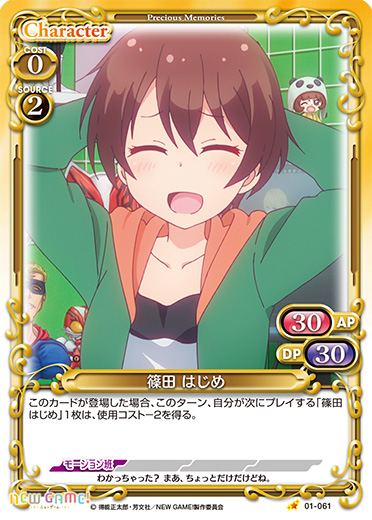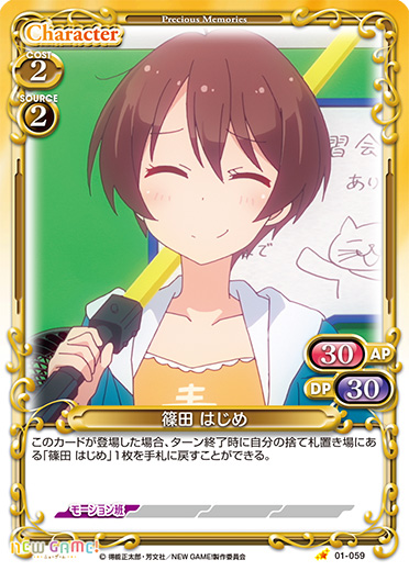 | このカードが登場した場合、このターン、自分が次にプレイする「篠田 はじめ」1枚は、使用コスト-2を得る。 | ||