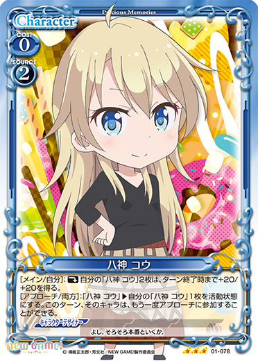 | [メイン/自分]:《休》自分の「八神 コウ」2枚は、ターン終了時まで+20/+20を得る。[アプローチ/両方]:「八神 コウ」▸自分の「八神 コウ」1枚を活動状態にする。このターン、そのキャラは、もう一度アプローチに参加することができる。 | ||