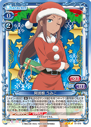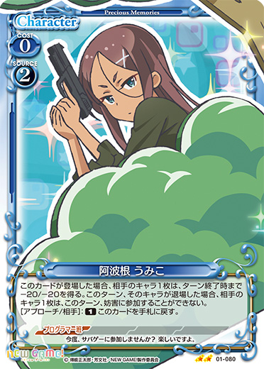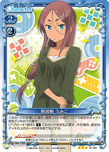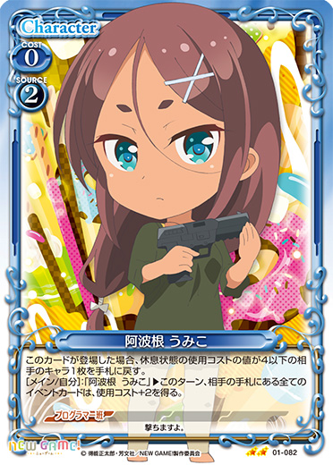 | このカードが登場した場合、休息状態の使用コストの値が4以下の相手のキャラ1枚を手札に戻す。[メイン/自分]:「阿波根 うみこ」▸相手の手札にある全てのイベントカードは、使用コスト+2を得る。 | ||