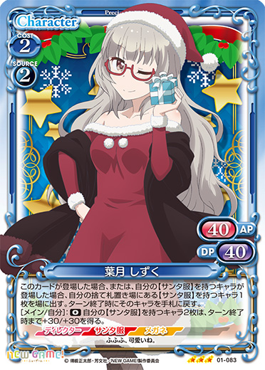 | このカードが登場した場合、相手のキャラ1枚は、ターン終了時まで-20/-20を得る。このターン、そのキャラが退場した場合、相手のキャラ1枚は、このターン、妨害に参加することができない。[アプローチ/相手]:《1》このカードを手札に戻す。 | ||