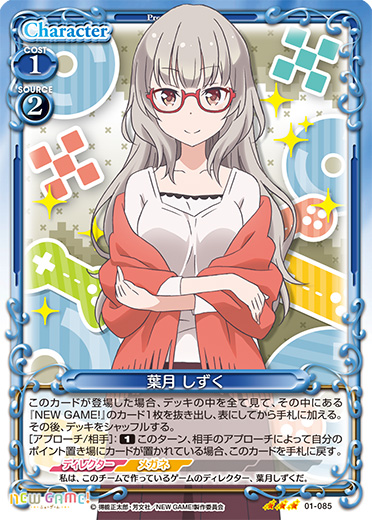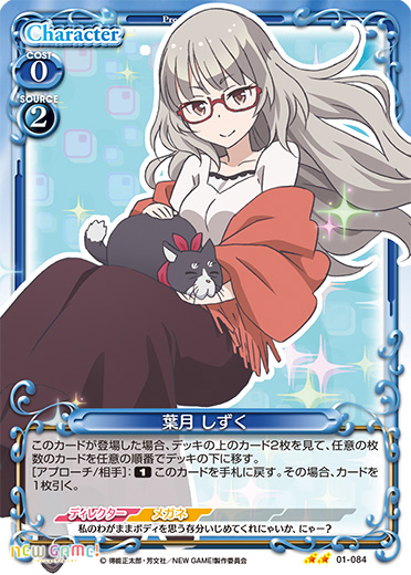 | このカードが登場した場合、使用コストの値が1以下の相手のキャラ1枚をデッキの下に移す。[アプローチ/相手]:《1》このカードを手札に戻す。その場合、相手のデッキの上のカード2枚を捨て札にする。 | ||