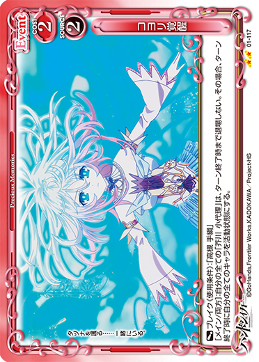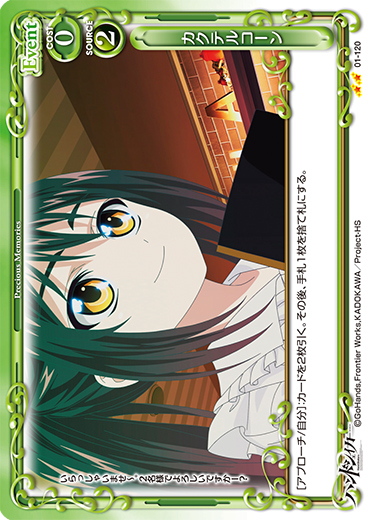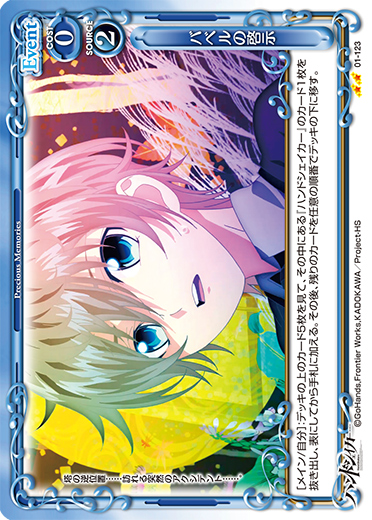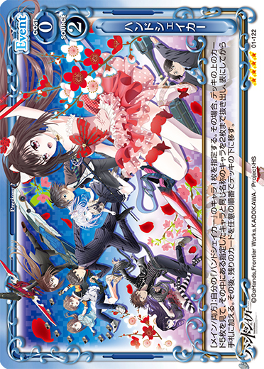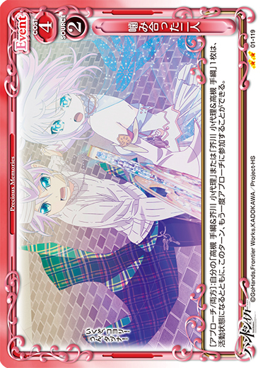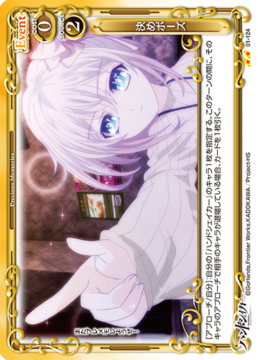| [アプローチ/自分]:自分の『ハンドシェイカー』のキャラ1枚を指定する。このターンの間に、そのキャラのアプローチで相手のキャラが退場している場合、カードを1枚引く。 | ||