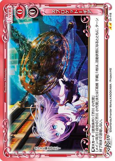 | 〔EXカード〕《使用条件》:「芥川 小代理」[アプローチ/両方]:自分の「芥川 小代理」または「高槻 手綱」1枚は、活動状態になるとともに、ターン終了時まで退場しない。 | ||