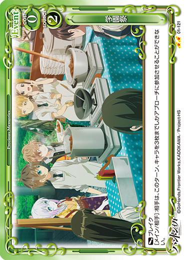 | 〔ブレイク〕《使用条件》:「高槻 手綱」[メイン/両方]:自分の全ての「芥川 小代理」は、ターン終了時まで退場しない。その場合、ターン終了時に自分の全てのキャラを活動状態にする。 | ||