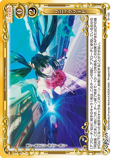 | このカードが登場した場合、自分のキャラ2枚は、ターン終了時まで+20/+20を得る。このターン、自分の『ハイスクール・フリート』のキャラが3枚以上アプローチに参加した場合、ターン終了時に自分のキャラ1枚をメインエリアに移すことができる。 | ||