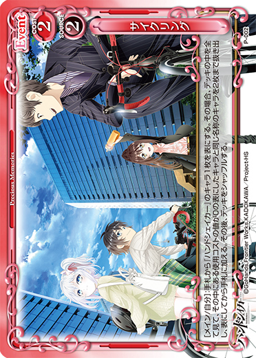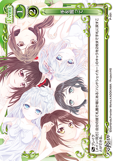 | [メイン/自分]:手札から『ハンドシェイカー』のキャラ1枚を表にする。その場合、デッキの中を全て見て、その中にある使用コストの値が0の表にしたキャラと同じ名称のキャラを2枚まで抜き出し、表にしてから手札に加える。その後、デッキをシャッフルする。 | ||