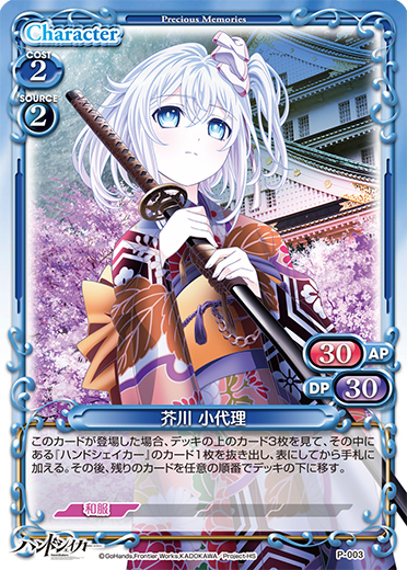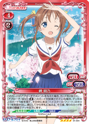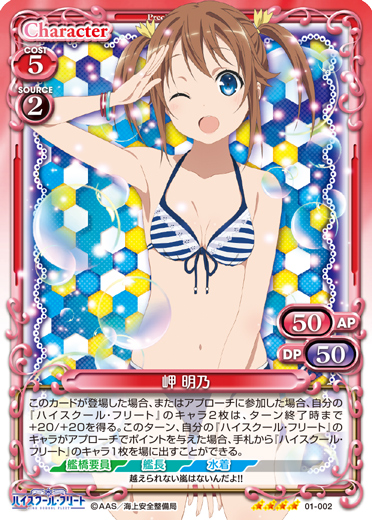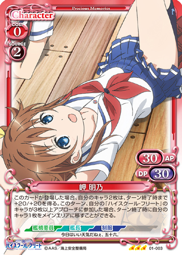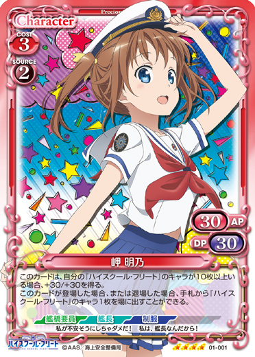 | このカードは、自分の『ハイスクール・フリート』のキャラが10枚以上いる場合、+30/+30を得る。このカードが登場した場合、または退場した場合、手札から『ハイスクール・フリート』のキャラ1枚を場に出すことができる。 | ||