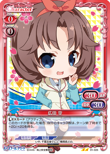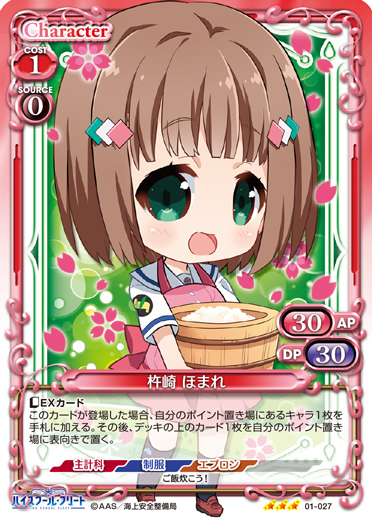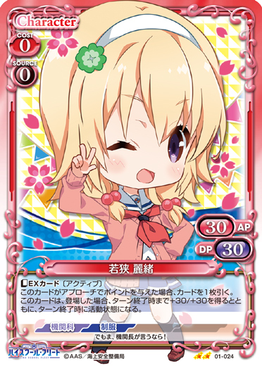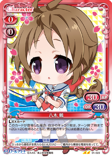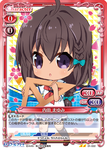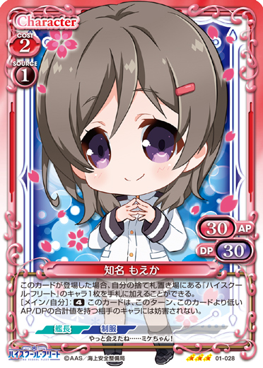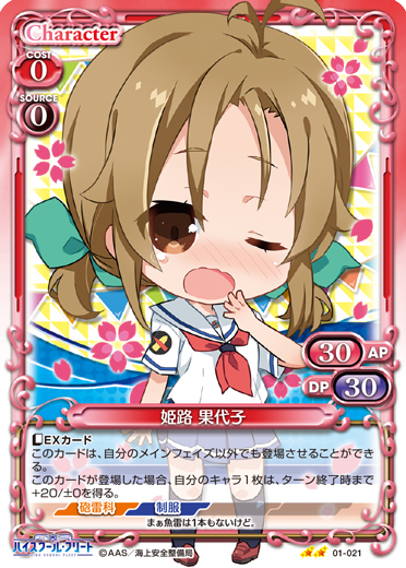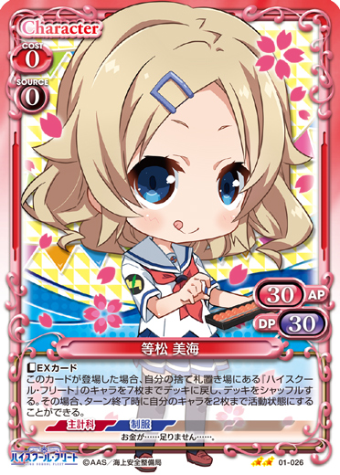 | このカードが登場した場合、自分の捨て札置き場にある『ハイスクール・フリート』のキャラ1枚を手札に加えることができる。[メイン/自分]:《4》このカードは、このターン、このカードより低いAP/DPの合計値を持つ相手のキャラには妨害されない。 | ||