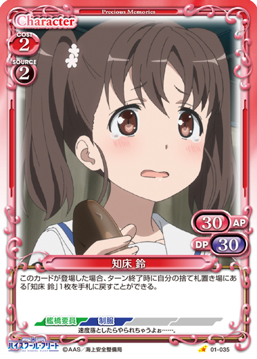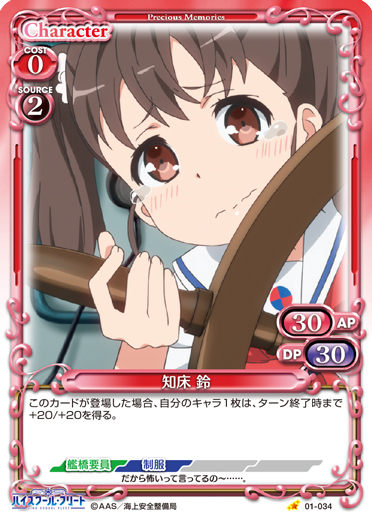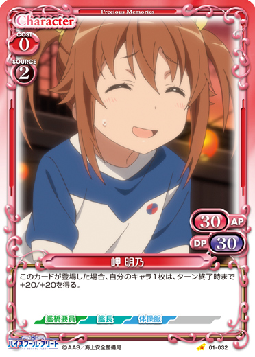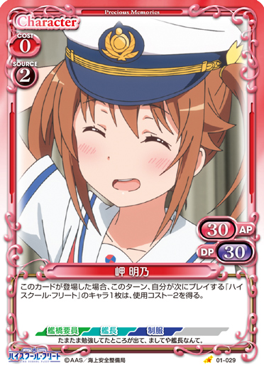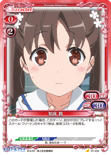 | このカードが登場した場合、このターン、自分が次にプレイする『ハイスクール・フリート』のキャラ1枚は、使用コスト-2を得る。 | ||