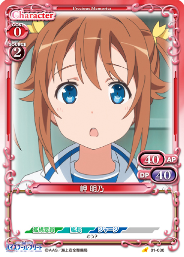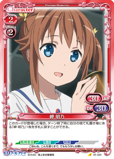 | このカードが登場した場合、ターン終了時に自分の捨て札置き場にある「岬 明乃」1枚を手札に戻すことができる。 | ||