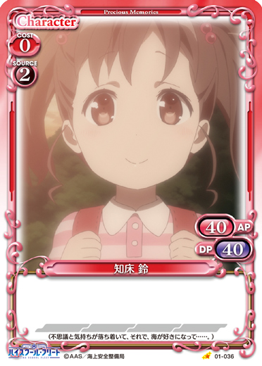 | このカードが登場した場合、ターン終了時に自分の捨て札置き場にある「知床 鈴」1枚を手札に戻すことができる。 | ||