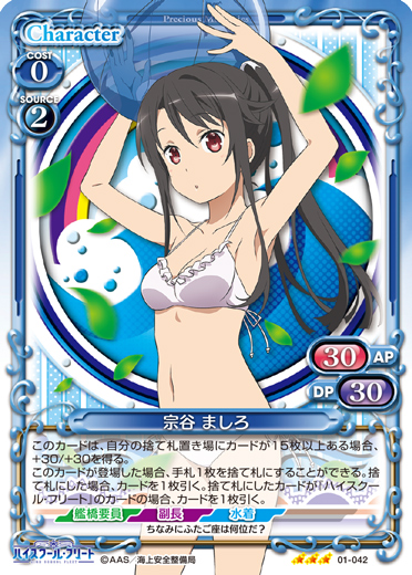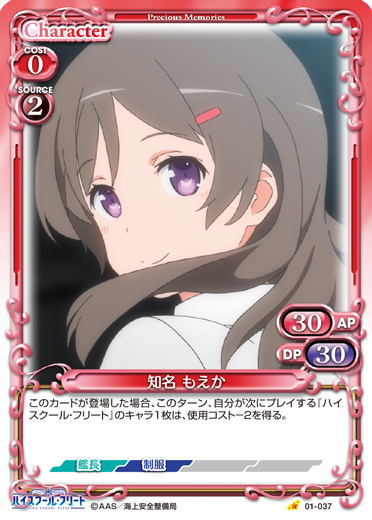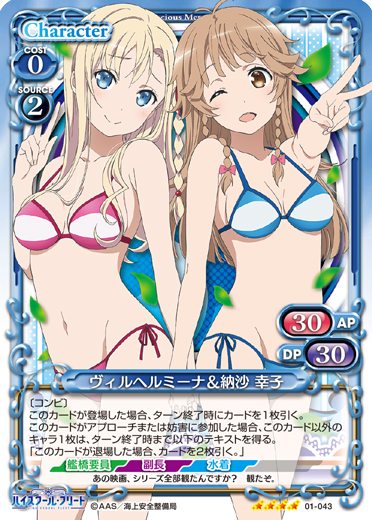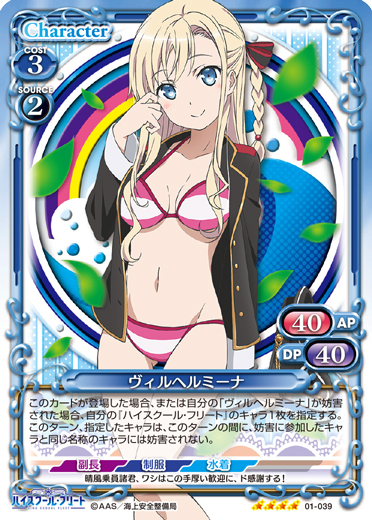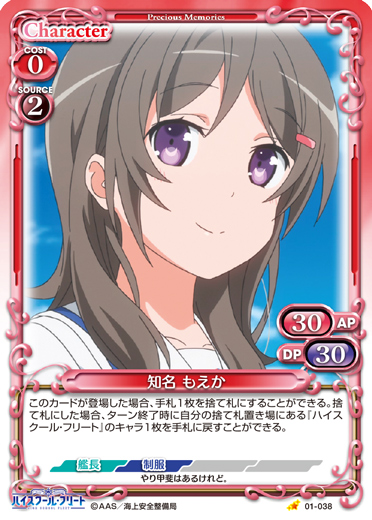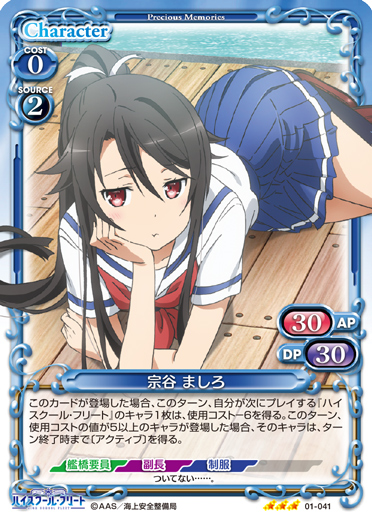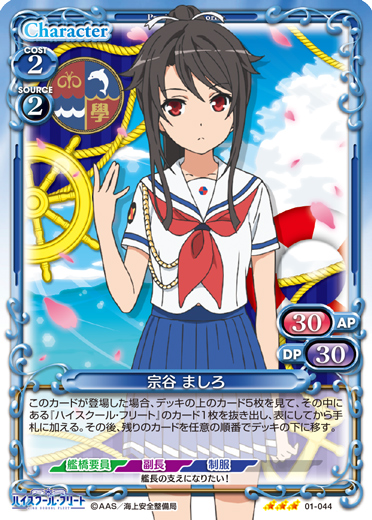 | このカードが登場した場合、このターン、自分が次にプレイする『ハイスクール・フリート』のキャラ1枚は、使用コスト-2を得る。 | ||