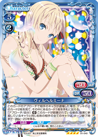 | このカードが登場した場合、または自分の「ヴィルヘルミーナ」が妨害された場合、自分の『ハイスクール・フリート』のキャラ1枚を指定する。このターン、指定したキャラは、このターンの間に、妨害に参加したキャラと同じ名称のキャラには妨害されない。 | ||