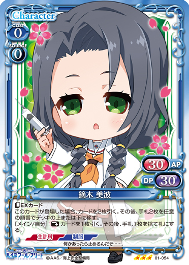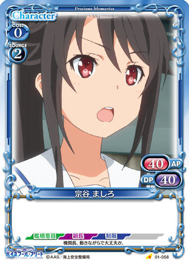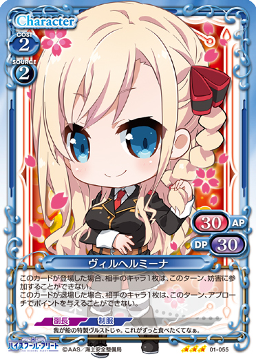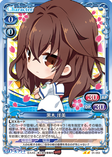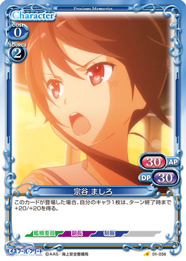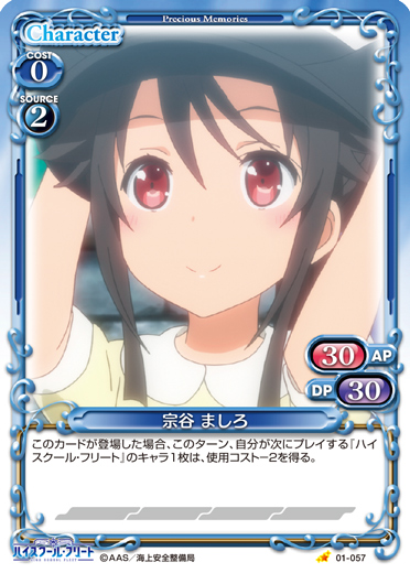 | このカードが登場した場合、このターン、自分が次にプレイする『ハイスクール・フリート』のキャラ1枚は、使用コスト-2を得る。 | ||