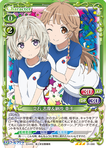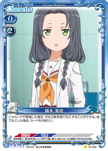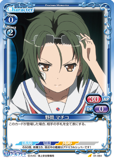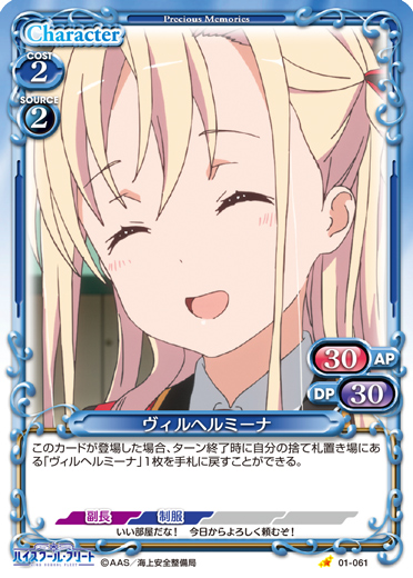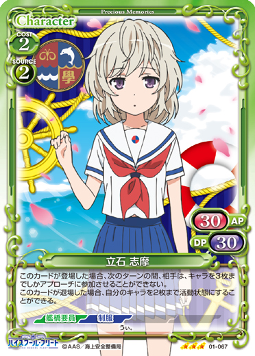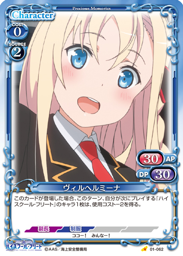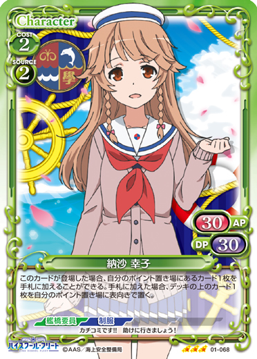 | このカードが登場した場合、このターン、自分が次にプレイする『ハイスクール・フリート』のキャラ1枚は、使用コスト-2を得る。 | ||