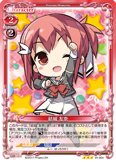 | このカードは、「結城 友奈」または「東郷 美森」のコストとして使用する場合、発生コスト+1を得る。[アプローチ/両方]:《休》自分のポイント置き場にあるカード1枚を手札に戻す。その場合、このカードを自分のポイント置き場に表向きで置く。 | ||