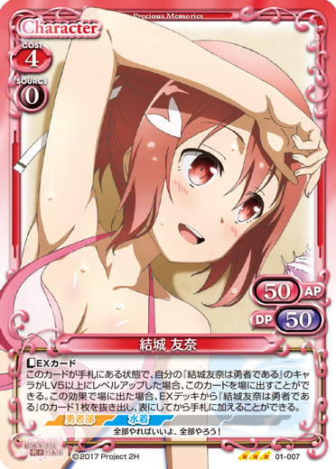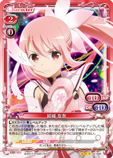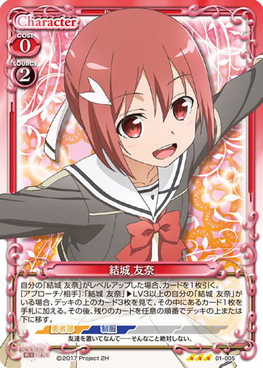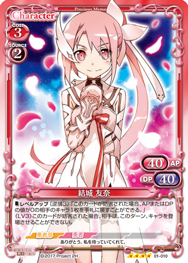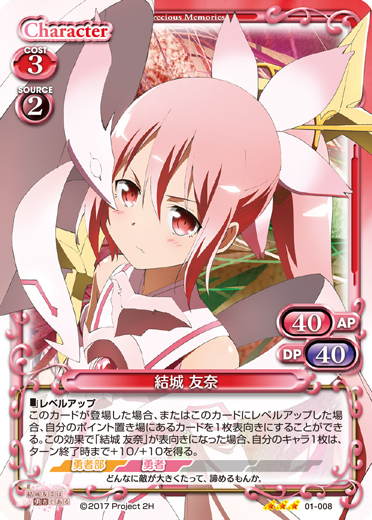 | 〔レベルアップ〕このカードが登場した場合、またはこのカードにレベルアップした場合、自分のポイント置き場にあるカードを1枚表向きにすることができる。この効果で「結城 友奈」が表向きになった場合、自分のキャラ1枚は、ターン終了時まで+10/+10を得る。 | ||