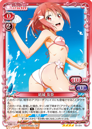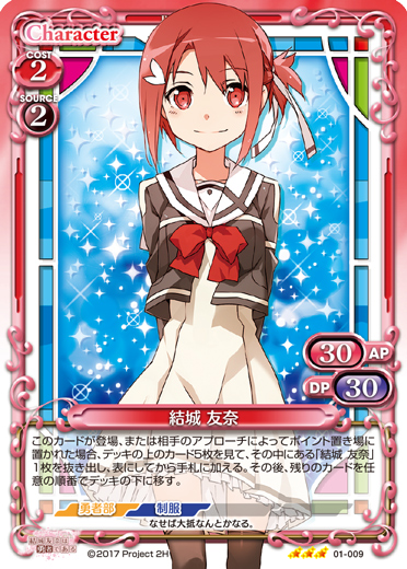| このカードが登場、または相手のアプローチによってポイント置き場に置かれた場合、デッキの上のカード5枚を見て、その中にある「結城 友奈」1枚を抜き出し、表にしてから手札に加える。その後、残りのカードを任意の順番でデッキの下に移す。 | ||