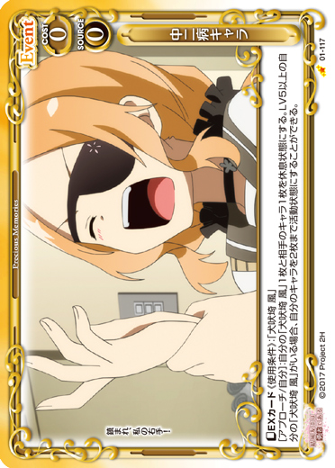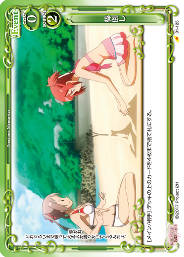 | 〔EXカード〕《使用条件》:「犬吠埼 風」[アプローチ/自分]:自分の「犬吠埼 風」1枚と相手のキャラ1枚を休息状態にする。LV5以上の自分の「犬吠埼 風」がいる場合、自分のキャラを2枚まで活動状態にすることができる。 | ||