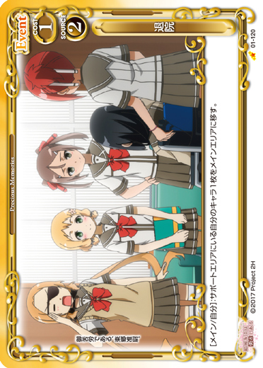 | [メイン/自分]:メインエリアにいる自分のキャラ1枚をサポートエリアに移す。その場合、カードを2枚引く。 | ||