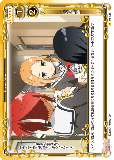 | [メイン/自分]:自分の捨て札置き場にある【勇者部】を持つキャラ1枚をサポートエリアに出す。 | ||