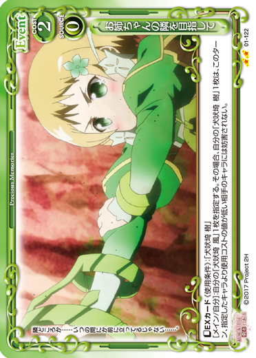 | 〔EXカード〕《使用条件》:「犬吠埼 樹」[メイン/自分]:自分の「犬吠埼 風」1枚を指定する。その場合、自分の「犬吠埼 樹」1枚は、このターン、指定したキャラより使用コストの値が低い相手のキャラには妨害されない。 | ||