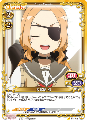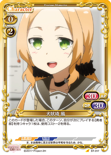 | このカードが登場した場合、このターン、自分が次にプレイする【勇者部】を持つキャラ1枚は、使用コスト-2を得る。 | ||