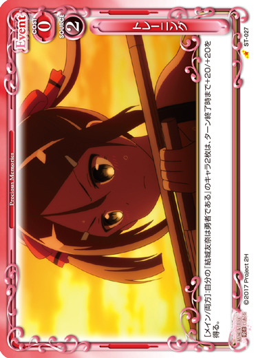 | [メイン/両方]:自分の『結城友奈は勇者である』のキャラ2枚は、ターン終了時まで+20/+20を得る。 | ||