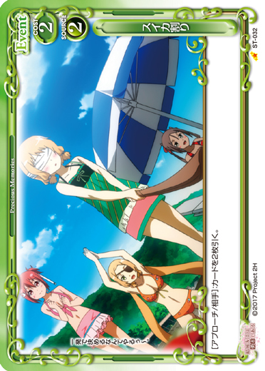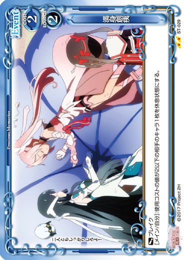 | 〔ブレイク〕[メイン/自分]:使用コストの値が2以下の相手のキャラ1枚を休息状態にする。 | ||