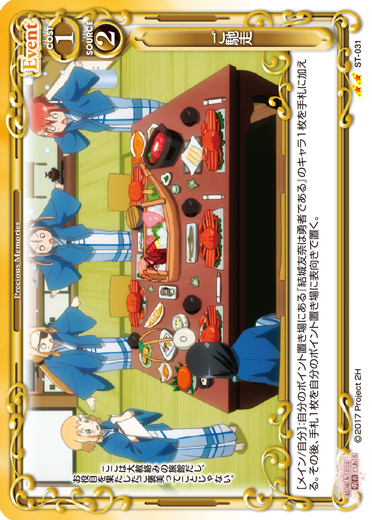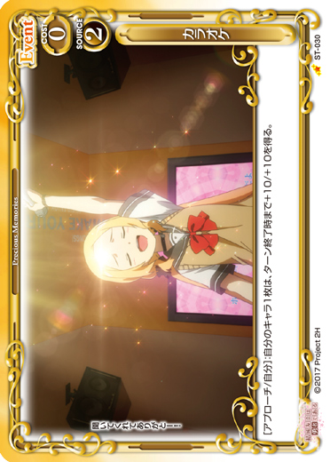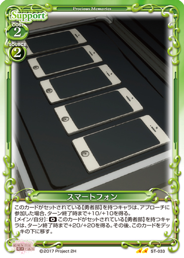 | このカードがセットされている【勇者部】を持つキャラは、アプローチに参加した場合、ターン終了時まで+10/+10を得る。[メイン/自分]:《0》このカードがセットされている【勇者部】を持つキャラは、ターン終了時まで+20/+20を得る。その後、このカードをデッキの下に移す。 | ||
