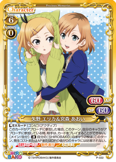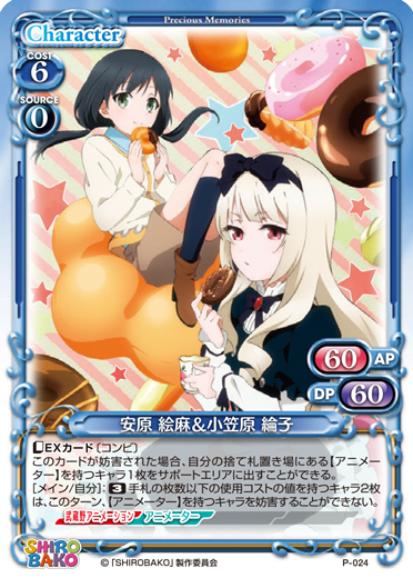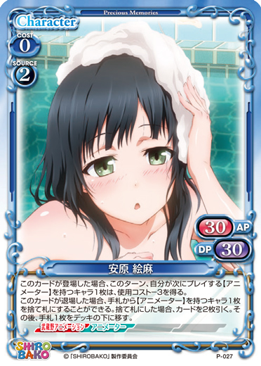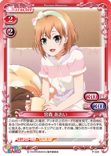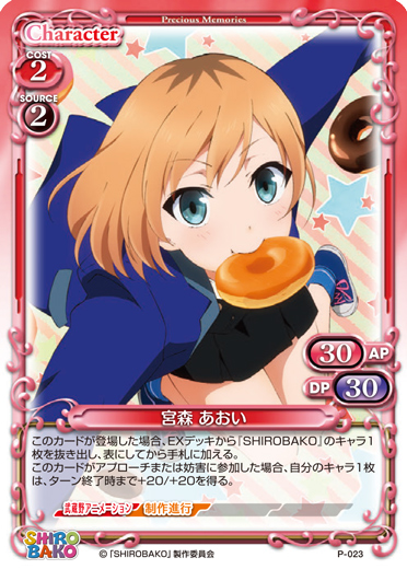 | このカードが登場した場合、EXデッキから『SHIROBAKO』のキャラ1枚を抜き出し、表にしてから手札に加える。このカードがアプローチまたは妨害に参加した場合、自分のキャラ1枚は、ターン終了時まで+20/+20を得る。 | ||