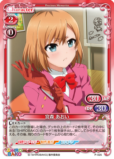 | 〔EXカード〕このカードが登場した場合、デッキの上のカード2枚を見て、その中にある『SHIROBAKO』のカード1枚を抜き出し、表にしてから手札に加える。その後、残りのカードをゲームから取り除く。 | ||