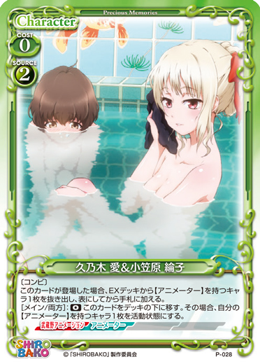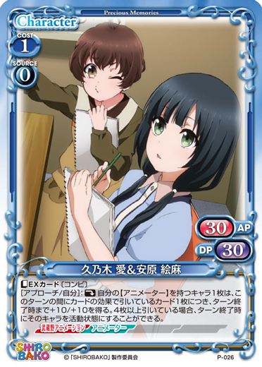 | 〔コンビ〕このカードが登場した場合、EXデッキから【アニメーター】を持つキャラ1枚を抜き出し、表にしてから手札に加える。[メイン/両方]:《0》このカードをデッキの下に移す。その場合、自分の【アニメーター】を持つキャラ1枚を活動状態にする。 | ||