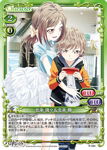 | 〔EXカード〕〔コンビ〕このカードが登場した場合、デッキの上のカード5枚を見て、その中にある「北条 璃々」または「北条 勝」1枚を抜き出し、場に出す。または、表にしてから手札に加える。その後、残りのカードを任意の順番でデッキの下に移す。 | ||