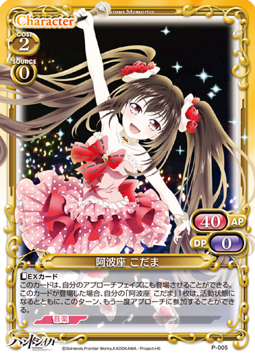 | 〔EXカード〕このカードは、自分のアプローチフェイズにも登場させることができる。このカードが登場した場合、自分の「阿波座 こだま」1枚は、活動状態になるとともに、このターン、もう一度アプローチに参加することができる。 | ||