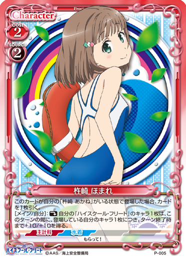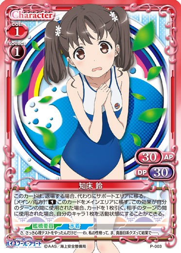 | このカードが自分の「杵崎 ほまれ」がいる状態で登場した場合、カードを1枚引く。[アプローチ/自分]:《休》自分の捨て札置き場にある『ハイスクール・フリート』のキャラを4枚まで任意の順番でデッキの下に移す。その場合、自分のキャラ1枚を活動状態にすることができる。 | ||