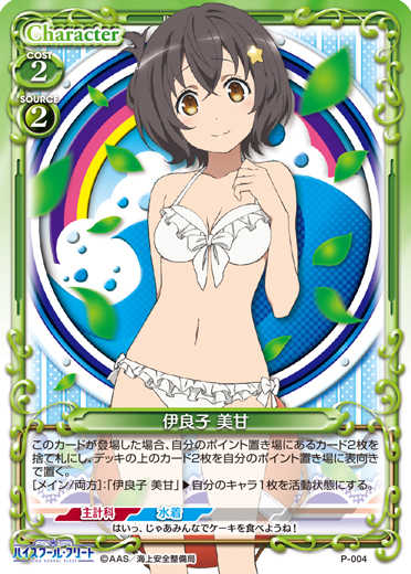 | このカードが登場した場合、自分のポイント置き場にあるカード2枚を捨て札にし、デッキの上のカード2枚を自分のポイント置き場に表向きで置く。[メイン/両方]:「伊良子 美甘」▸自分のキャラ1枚を活動状態にする。 | ||