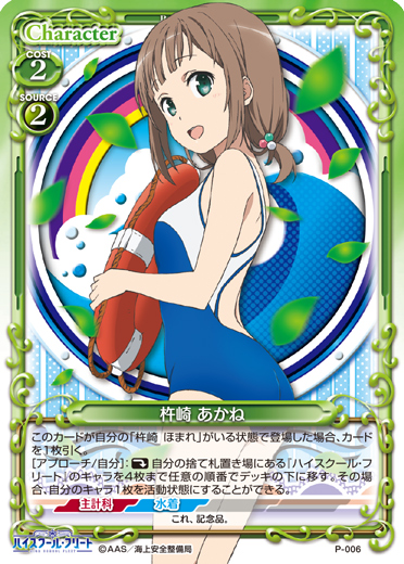 | このカードが自分の「杵崎 あかね」がいる状態で登場した場合、カードを1枚引く。[メイン/自分]:《休》自分の『ハイスクール・フリート』のキャラ1枚は、このターンの間に、登場している自分のキャラ1枚につき、ターン終了時まで+10/+10を得る。 | ||