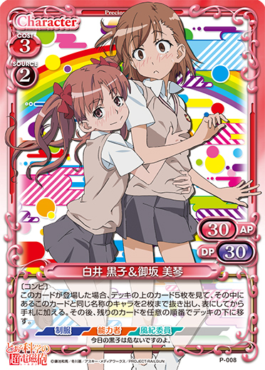 | 〔コンビ〕このカードが登場した場合、自分の捨て札置き場にあるレベルアップを持つ『とある科学の超電磁砲』のキャラ1枚を手札に戻すことができる。 | ||