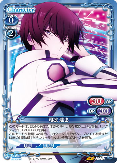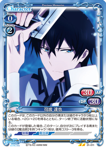 | このカードは、このカード以外の自分の青または緑のキャラが3枚以上いる場合、+20/+20を得るとともに、ターン終了時に活動状態になる。このカードが登場した場合、このターン、自分が次にプレイする青または緑の【魔法師】を持つキャラ1枚は、使用コスト-3を得る。 | ||