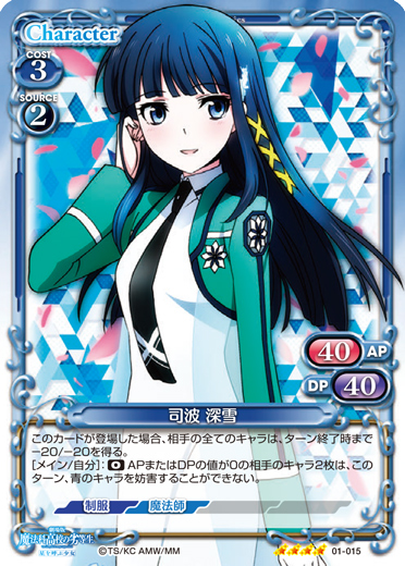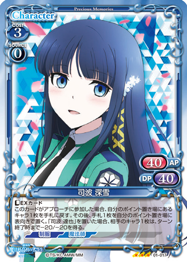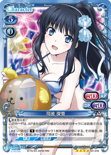 | 〔EXカード〕このカードがアプローチに参加した場合、自分のポイント置き場にあるキャラ1枚を手札に戻す。その後、手札1枚を自分のポイント置き場に表向きで置く。「司波 達也」を置いた場合、相手のキャラ1枚は、ターン終了時まで-20/-20を得る。 | ||