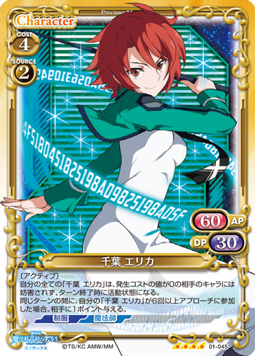 | 〔アクティブ〕自分の全ての「千葉 エリカ」は、発生コストの値が0の相手のキャラには妨害されず、ターン終了時に活動状態になる。同じターンの間に、自分の「千葉 エリカ」が6回以上アプローチに参加した場合、相手に1ポイント与える。 | ||