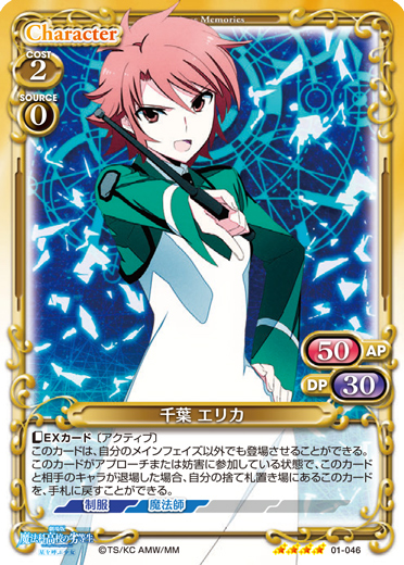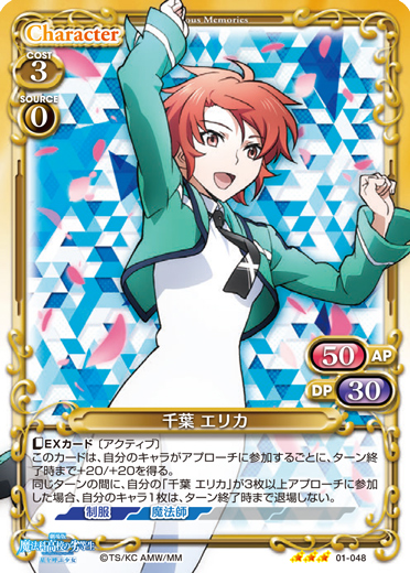 | 〔EXカード〕〔アクティブ〕このカードは、自分のキャラがアプローチに参加するごとに、ターン終了時まで+20/+20を得る。同じターンの間に、自分の「千葉 エリカ」が3枚以上アプローチに参加した場合、自分のキャラ1枚は、ターン終了時まで退場しない。 | ||