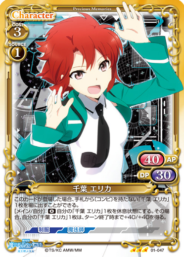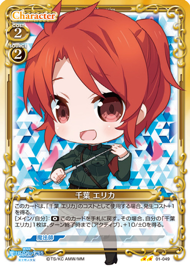 | このカードは、「千葉 エリカ」のコストとして使用する場合、発生コスト+1を得る。[メイン/自分]:《0》このカードを手札に戻す。その場合、自分の「千葉 エリカ」1枚は、ターン終了時まで〔アクティブ〕、+10/±0を得る。 | ||