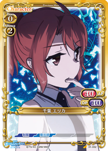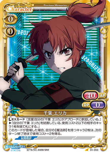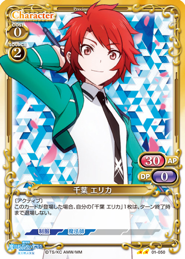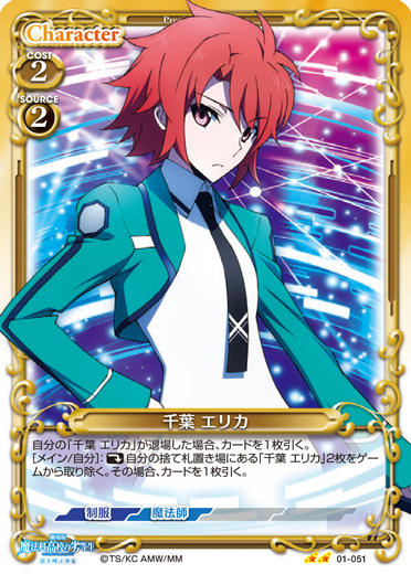 | 〔EXカード〕〔支援:自分の「千葉 エリカ」がアプローチに参加している。〕>「自分の「千葉 エリカ」を妨害している、使用コスト2以下の相手のキャラ1枚を捨て札にする。」このカードが登場した場合、自分の【魔法師】を持つキャラ2枚は、次のターン終了時まで使用コスト+2を得る。 | ||