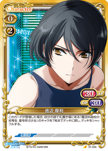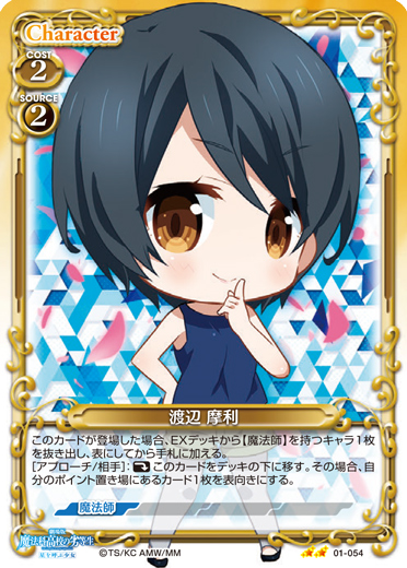 | このカードが登場した場合、EXデッキから【魔法師】を持つキャラ1枚を抜き出し、表にしてから手札に加える。[アプローチ/相手]:《休》このカードをデッキの下に移す。その場合、自分のポイント置き場にあるカード1枚を表向きにする。 | ||