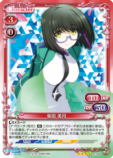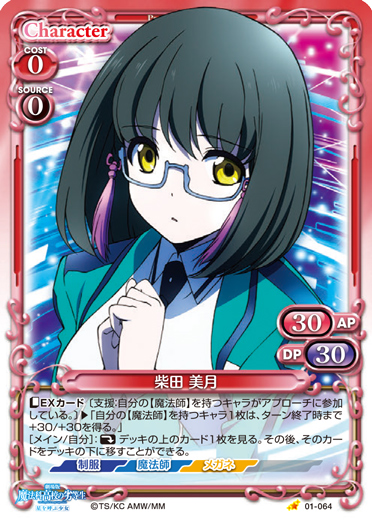 | 〔EXカード〕〔支援:自分の【魔法師】を持つキャラがアプローチに参加している。〕>「自分の【魔法師】を持つキャラ1枚は、ターン終了時まで+30/+30を得る。」[メイン/自分]:《休》デッキの上のカード1枚を見る。その後、そのカードをデッキの下に移すことができる。 | ||