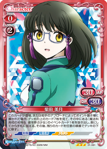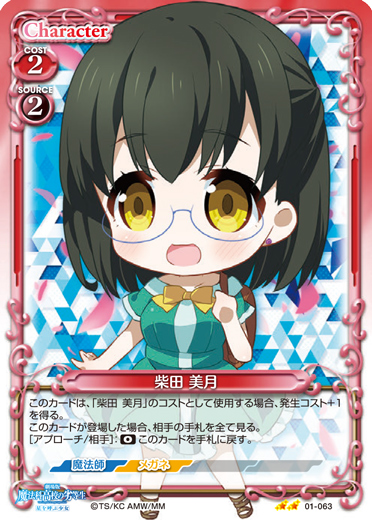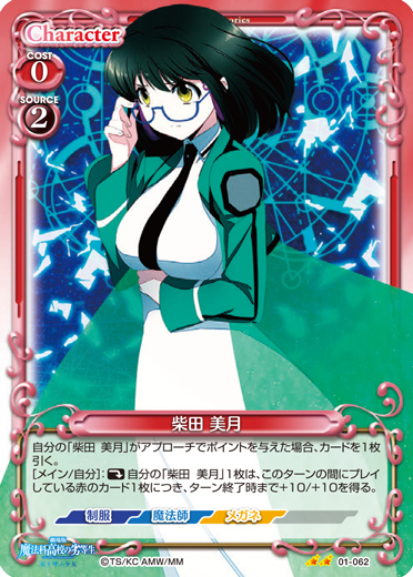 | このカードは、「柴田 美月」のコストとして使用する場合、発生コスト+1を得る。このカードが登場した場合、相手の手札を全て見る。[アプローチ/相手]:《0》このカードを手札に戻す。 | ||