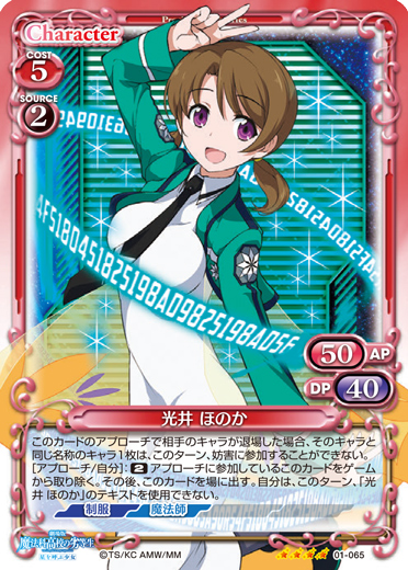 | このカードが登場、または相手のアプローチによってポイント置き場に置かれた場合、デッキの上のカード7枚を見て、その中にある『魔法科高校の劣等生 星を呼ぶ少女』のイベントカード1枚を抜き出し、表にしてから手札に加える。その後、残りのカードを任意の順番でデッキの下に移す。 | ||